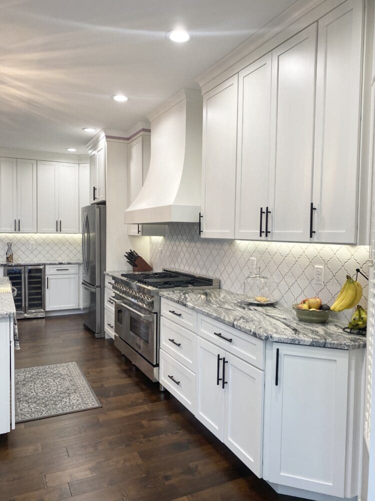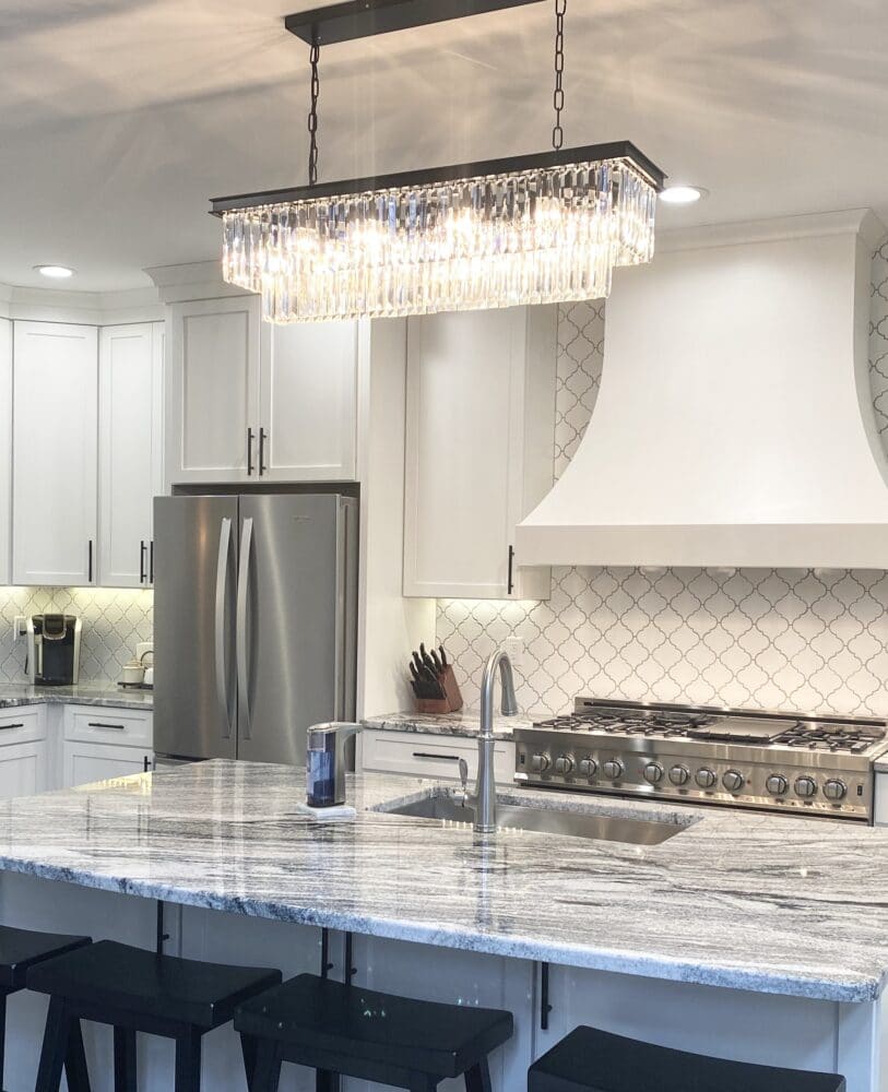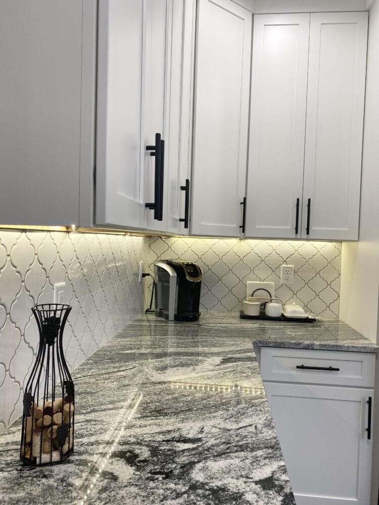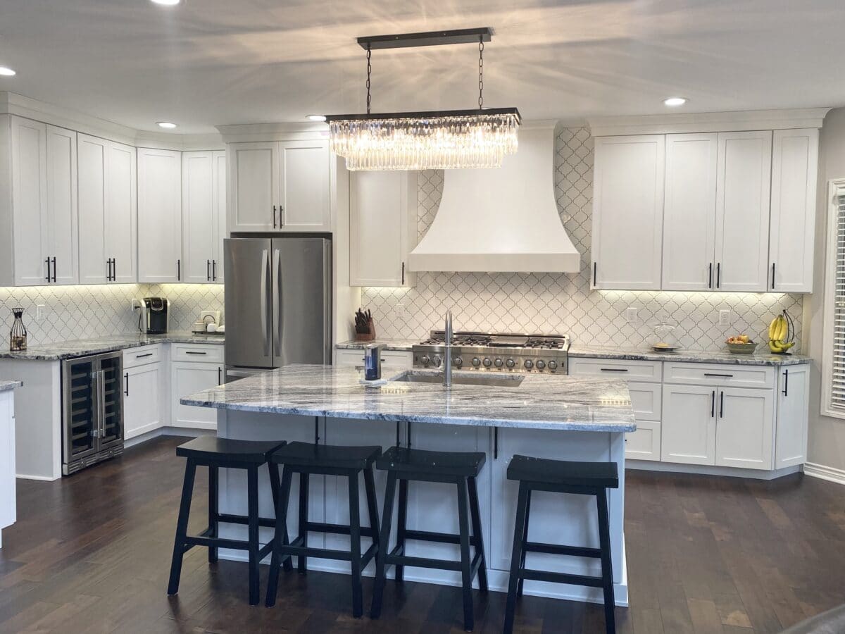 This remodel was so fun to do! Client was prepared and had a vision for what the family wanted and how to make the space work better for them. This involved a total gut of the kitchen and strategical planning to keep the timeline flowing efficiently. The before and after is amazing, not only did it open up the space and give them more functional room, it tied in so nice with other updates that had been completed as well. Beautiful white cabinetry and arabesque tile look stunning against the granite with black veining to make this kitchen a definite showstopper.